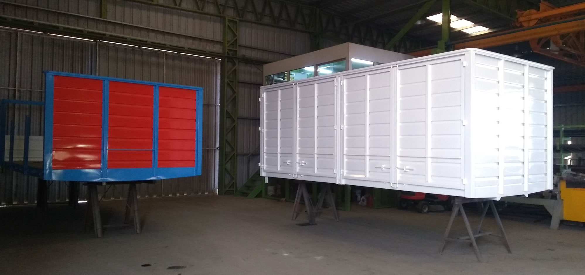 Base metálica en chapa espesor 3,2 mm., Frente construido en chapa estampada de 1.6 mm de espesor, Laterales con puertas desmontables y rebatibles, Puertas metálicas estampadas, parantes laterales desmontables con bulones..